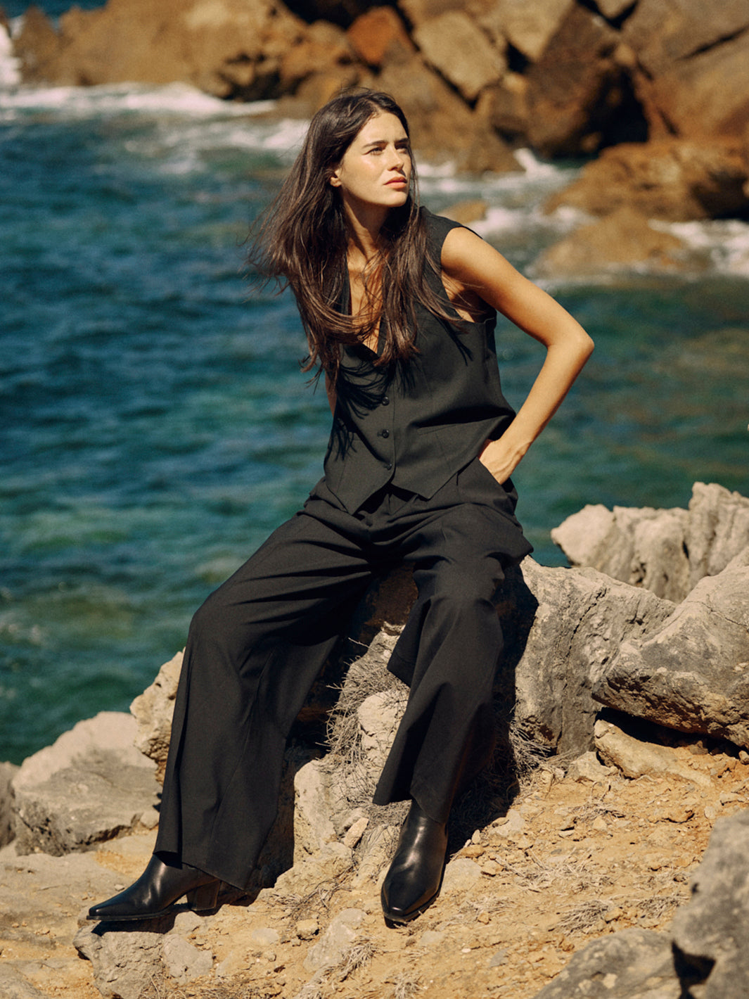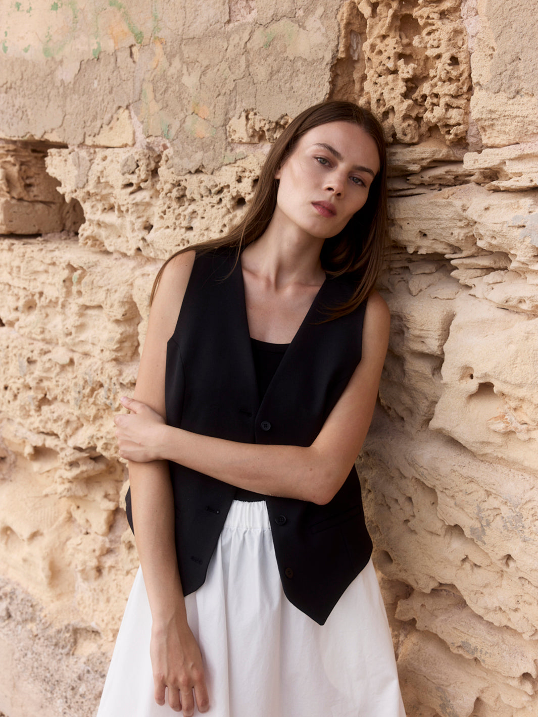 Unsere Weste aus nachhaltiger, weicher Tuchwolle ist ein zeitloses Key-Piece für deine Capsule Wardrobe. Der klare, leicht taillierte Schnitt verleiht ihr eine feminine Linie – perfekt für moderne, minimalistische Looks.