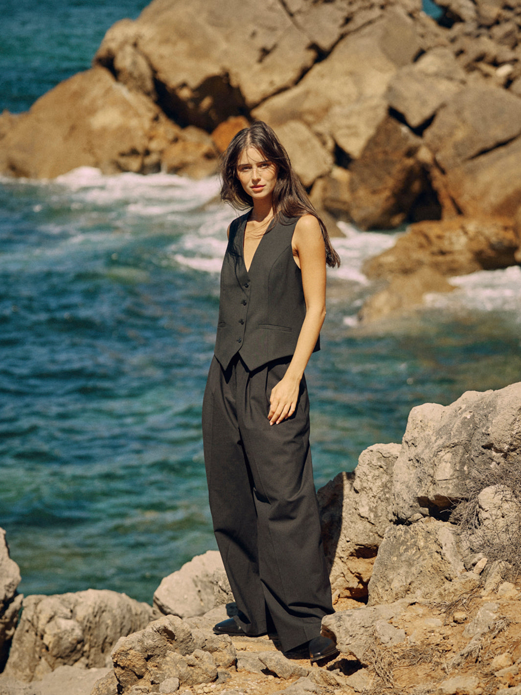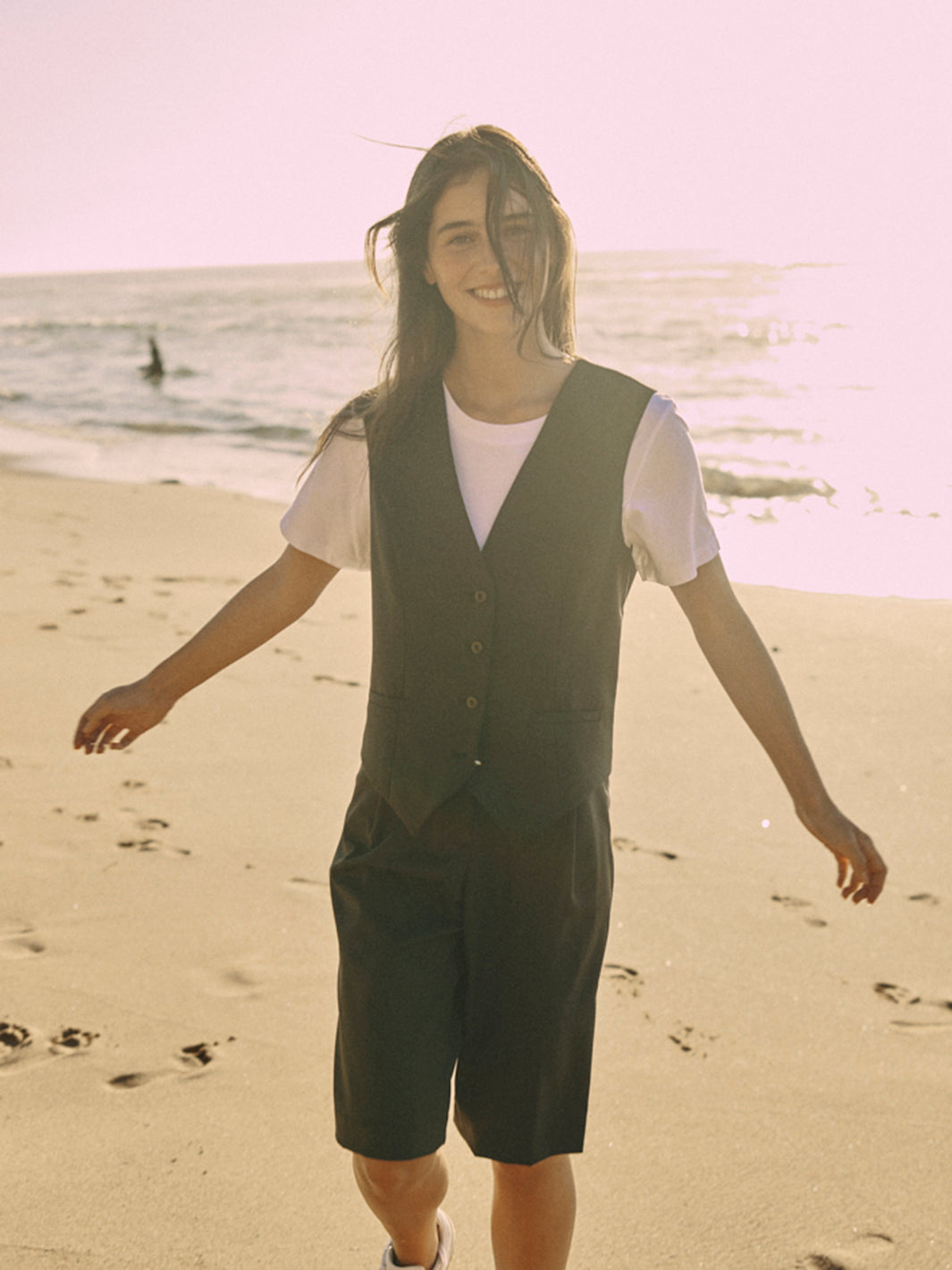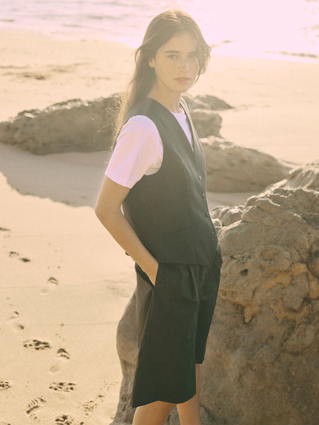 Ob zur Bermuda, unseren Wool Pants oder zum Midi Rock: Diese Weste lässt sich unglaublich vielseitig stylen. Pur getragen, mit Tanktop oder mit T-Shirt entsteht im Handumdrehen ein smarter, cooler oder femininer Look.