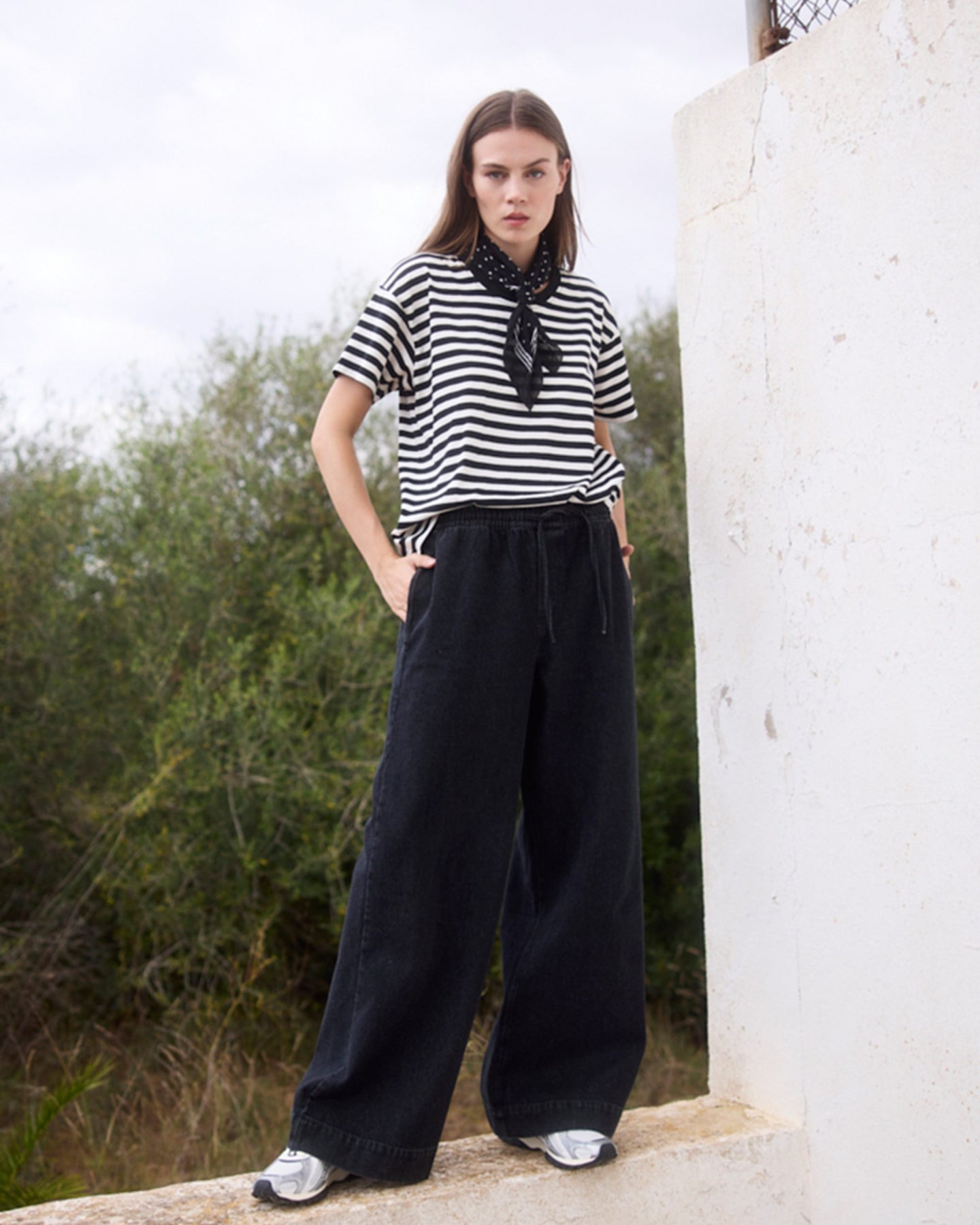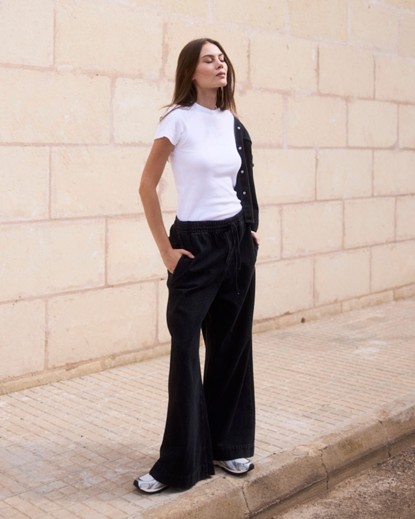 Unsere Black Denim Wide Leg aus reiner Bio-Baumwolle verbindet entspannten Komfort mit einer modernen, fließenden Silhouette. Die weiche, schwarz-graue Waschung wirkt clean und zeitlos, während der elastische Bund und die Drawstrings dem Style eine lässige Leichtigkeit geben.