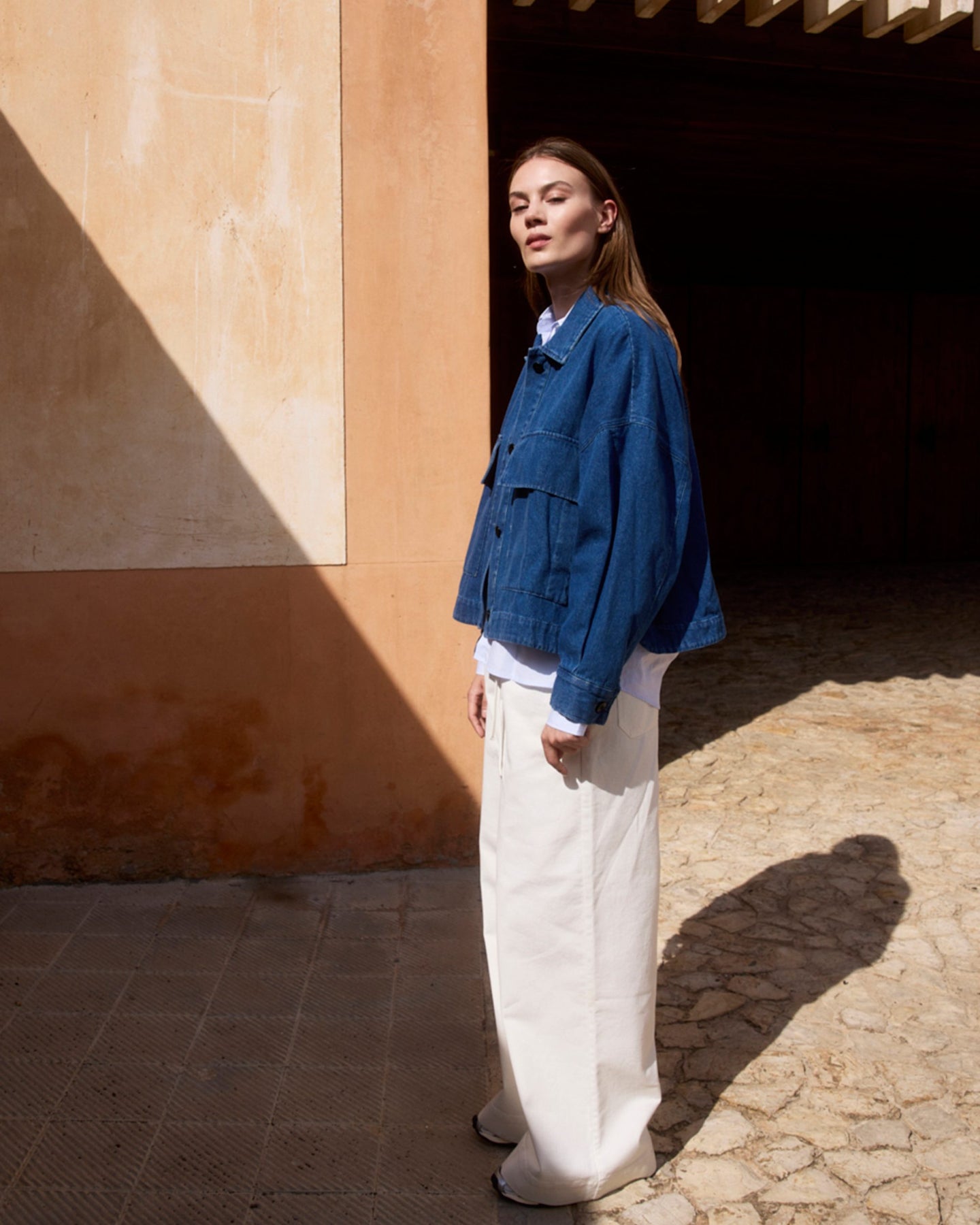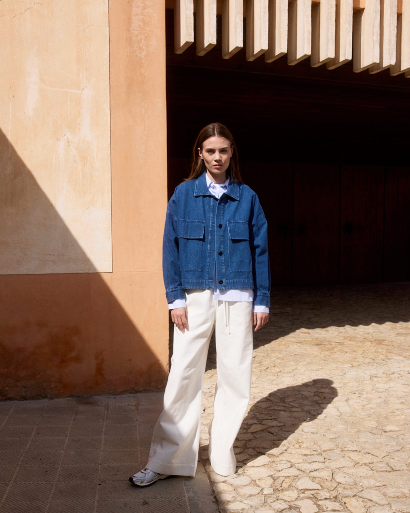 Damen Offwhite Wide Leg Hose aus Organic Cotton von WOTE, weit geschnitten mit elastischem Bund, kombiniert mit Hemd und Jeansjacke im modernen Layering-Look.