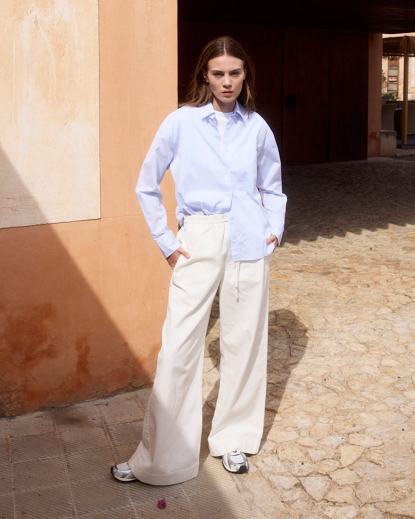 Damen Offwhite Wide Leg Hose aus Organic Cotton von WOTE in ruhiger seitenansicht, kombiniert mit Oversize-Hemd.