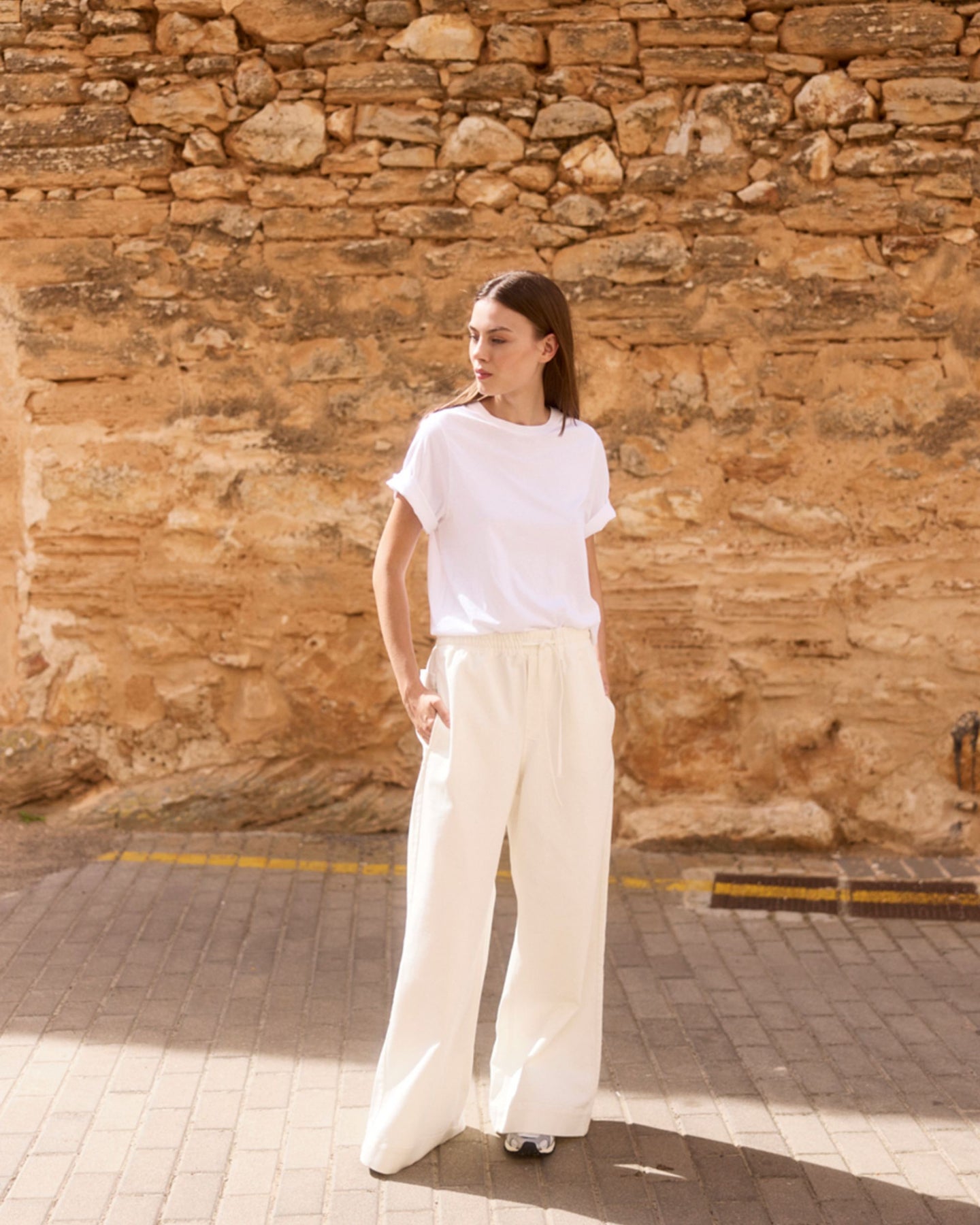 Damen Offwhite Wide Leg Hose aus Organic Cotton von WOTE, locker geschnittene Passform mit elastischem Bund, kombiniert mit weißem T-Shirt.