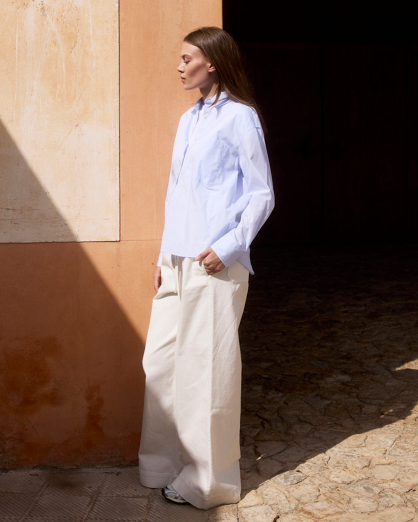 Damen Offwhite Wide Leg Hose aus Organic Cotton von WOTE in seitenansicht, kombiniert mit hellblauem Hemd.