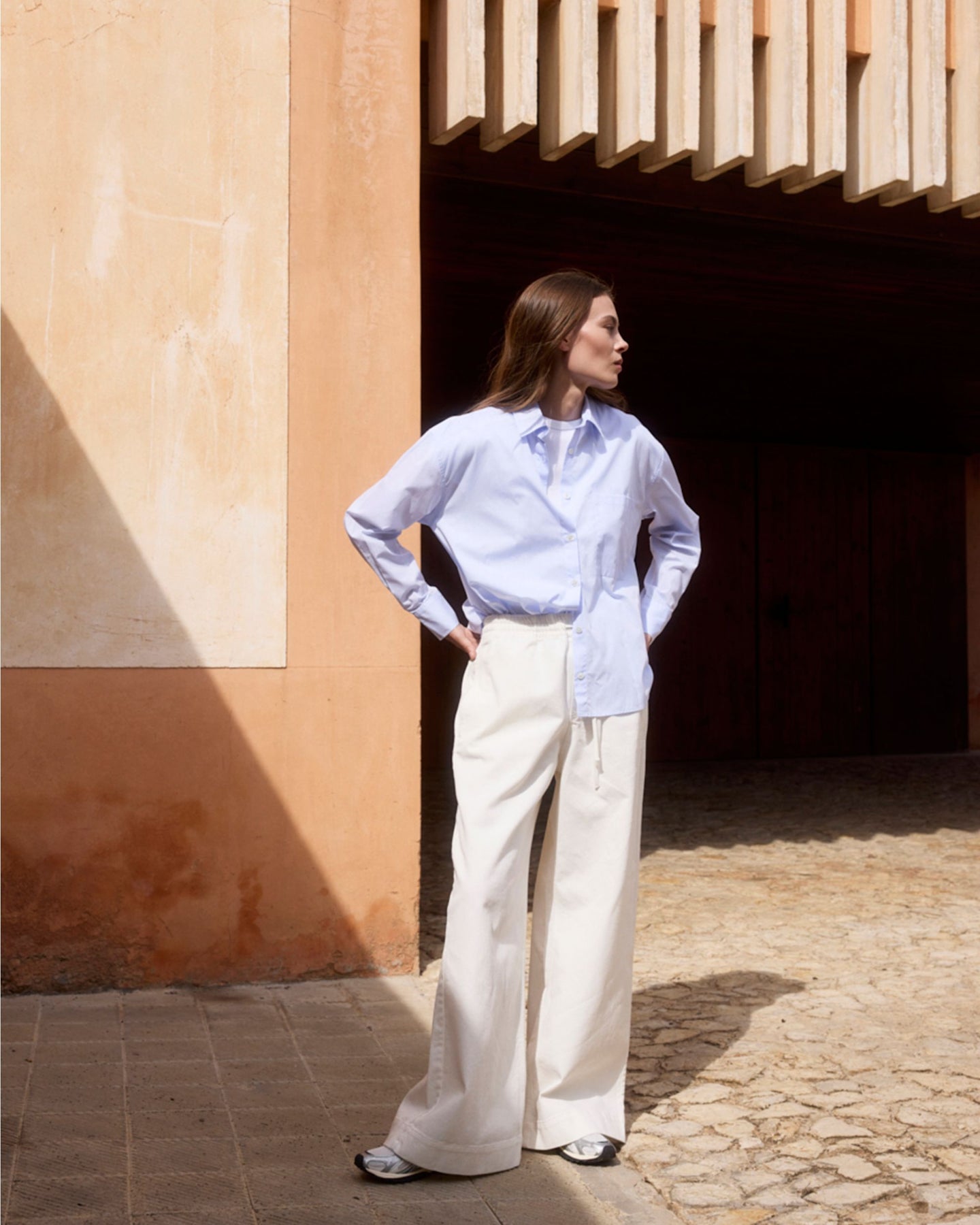 Damen Offwhite Wide Leg Hose aus Organic Cotton von WOTE, Frontansicht mit hellblauem Hemd in mediterraner Umgebung.