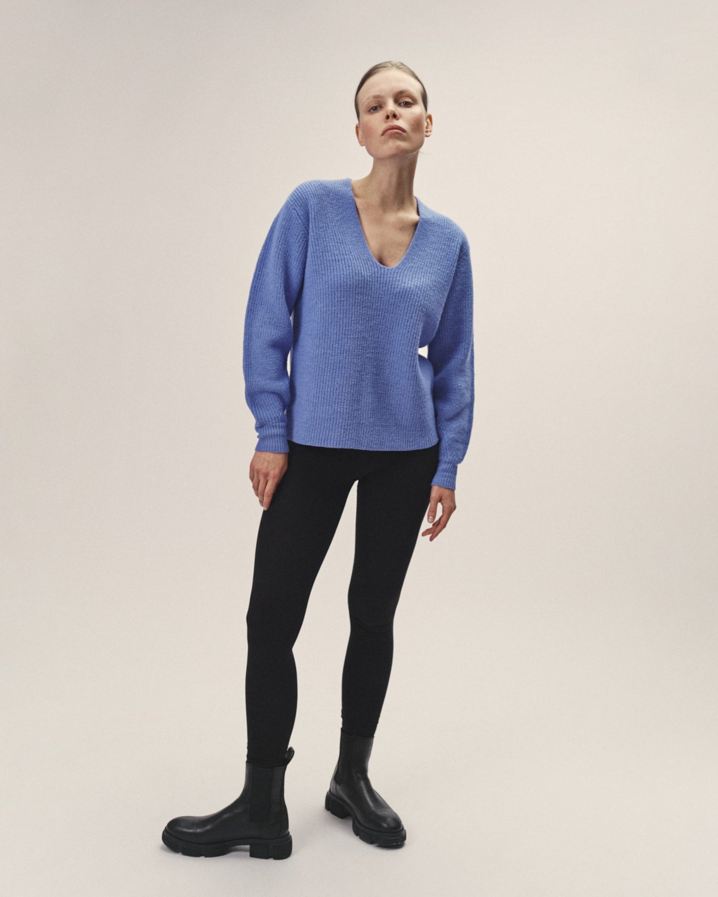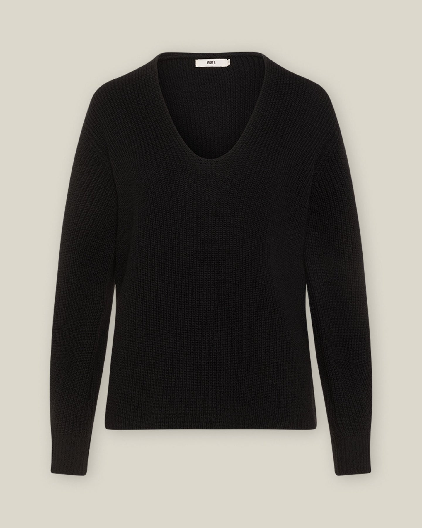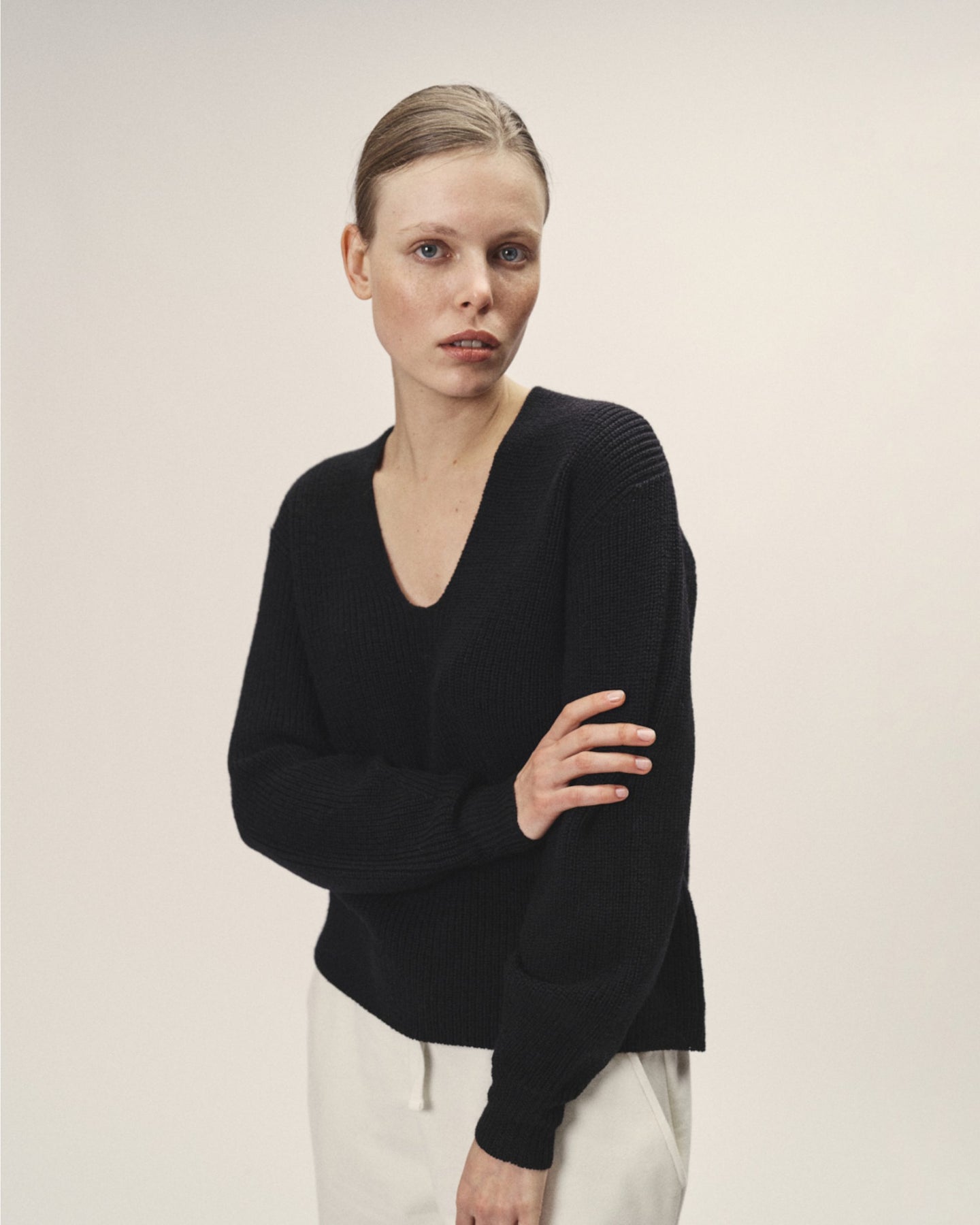 Ein femininer Klassiker, neu interpretiert: Unser V-Neck Strickpullover aus nachhaltiger Merinowolle verbindet Eleganz mit modernem Minimalismus. Der sanft abgerundete V-Ausschnitt schmeichelt der Silhouette und lässt Raum für Layering, während die Rippenstruktur und die feinen Minderungsdetails dem Pullover eine hochwertige, ruhige Struktur verleihen.