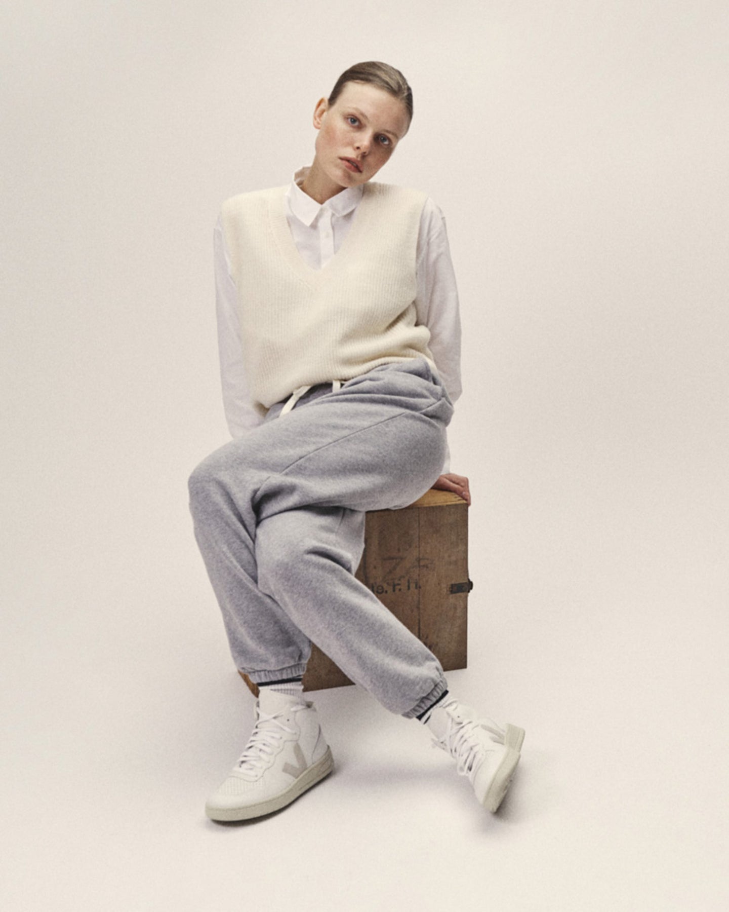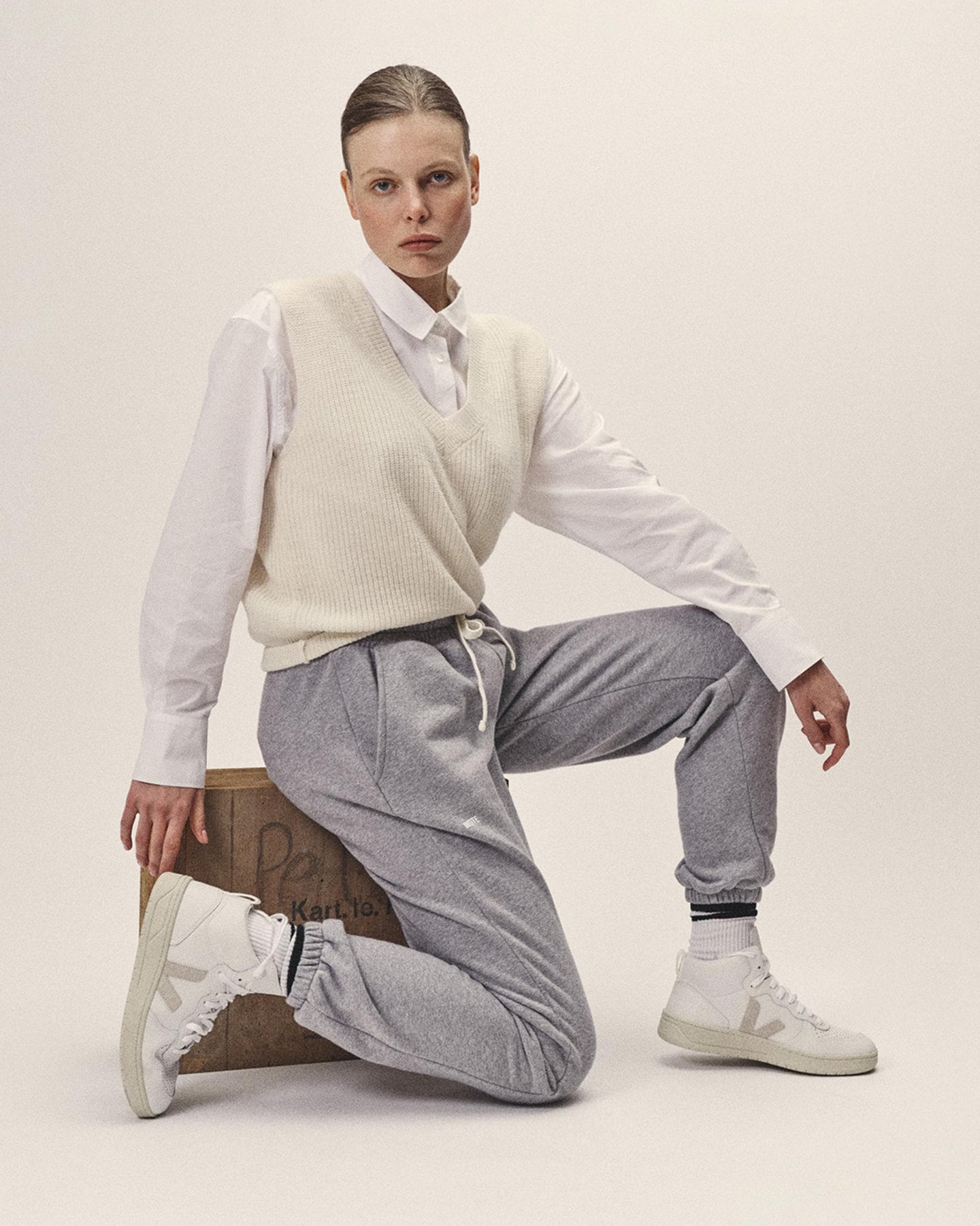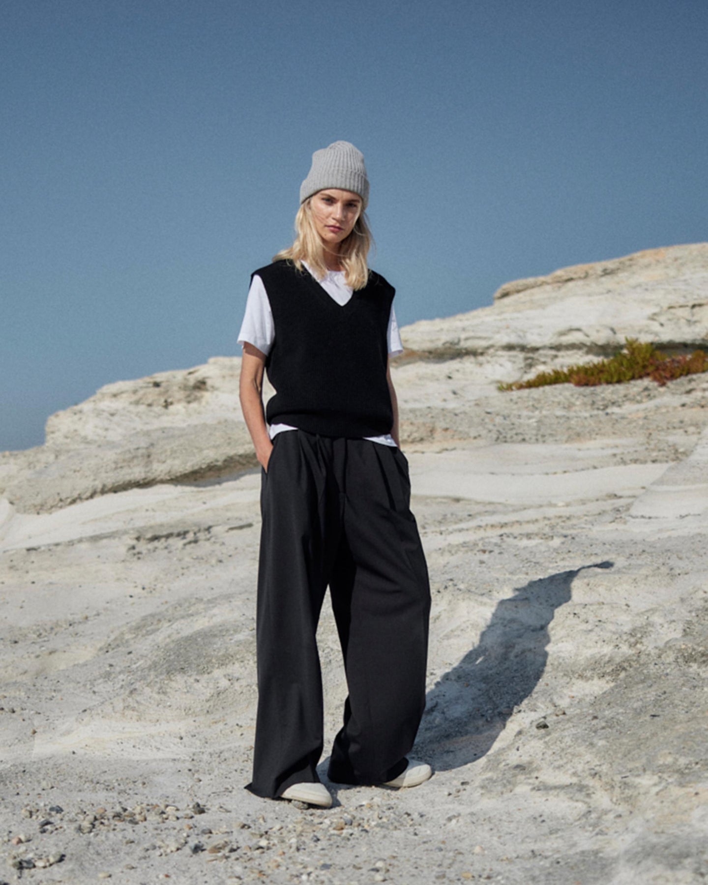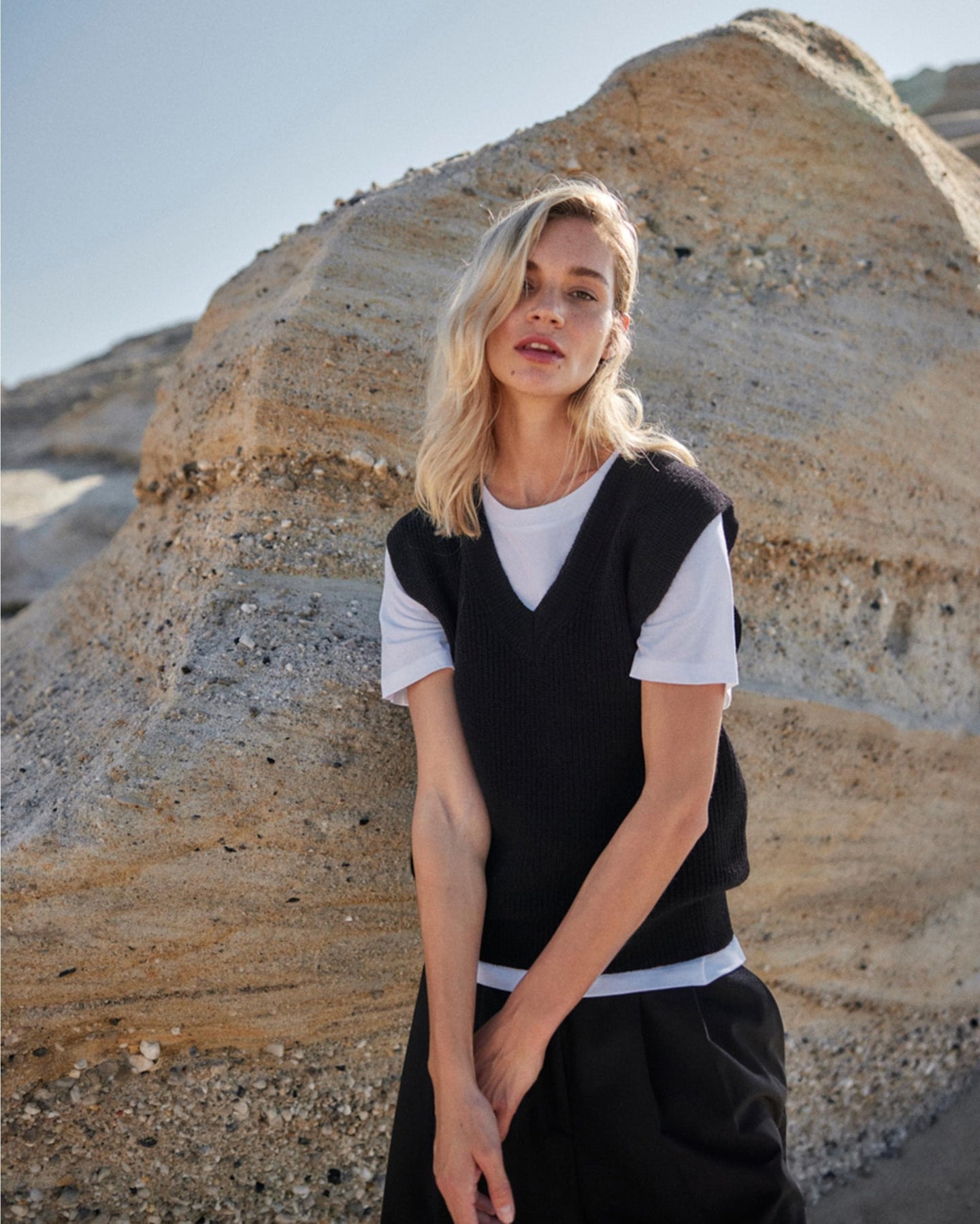 Unser Strick Pullunder mit tiefem V-Ausschnitt ist ein modernes Essential, das feminine Eleganz mit entspanntem Styling verbindet. Die hochwertige, nachhaltige Merinowolle schenkt ein softes, warmes Tragegefühl, während die Rippenstruktur und die lässige Form dem Design eine sportiv-edgy Note verleihen.