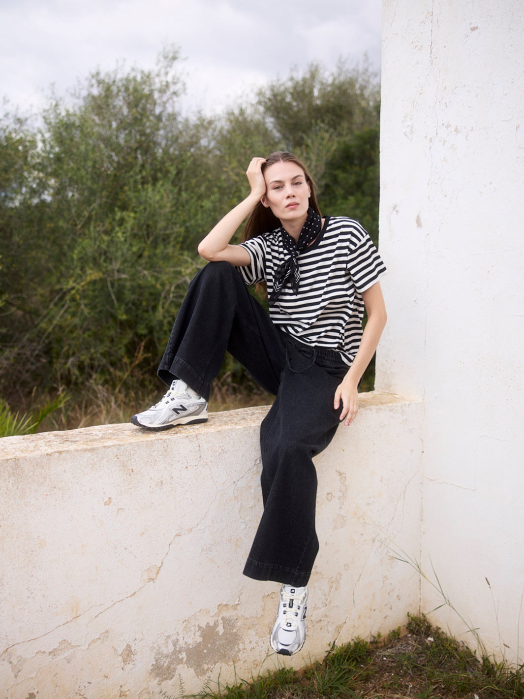 Damen Black Denim Wide Leg aus Bio-Baumwolle, sitzend gestylt mit schwarz-weiß gestreiftem T-Shirt und Halstuch.