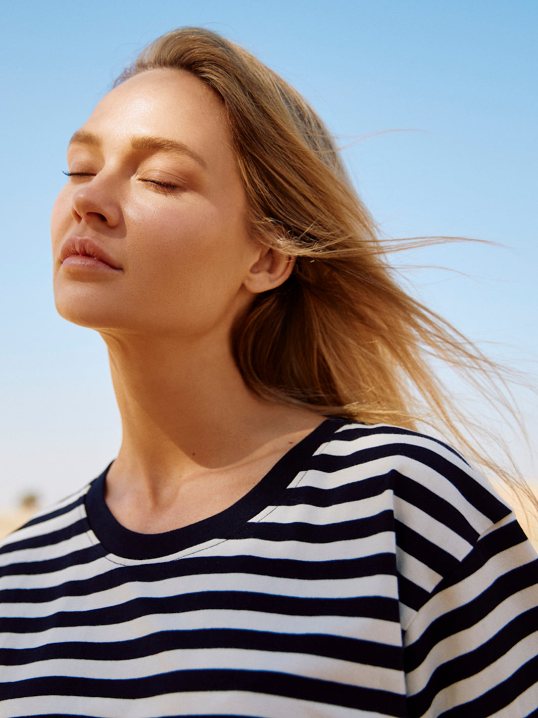 Nahaufnahme eines Modells im schwarz-weiß gestreiften Relaxed-Fit T-Shirt aus Bio-Baumwolle vor blauem Himmel.