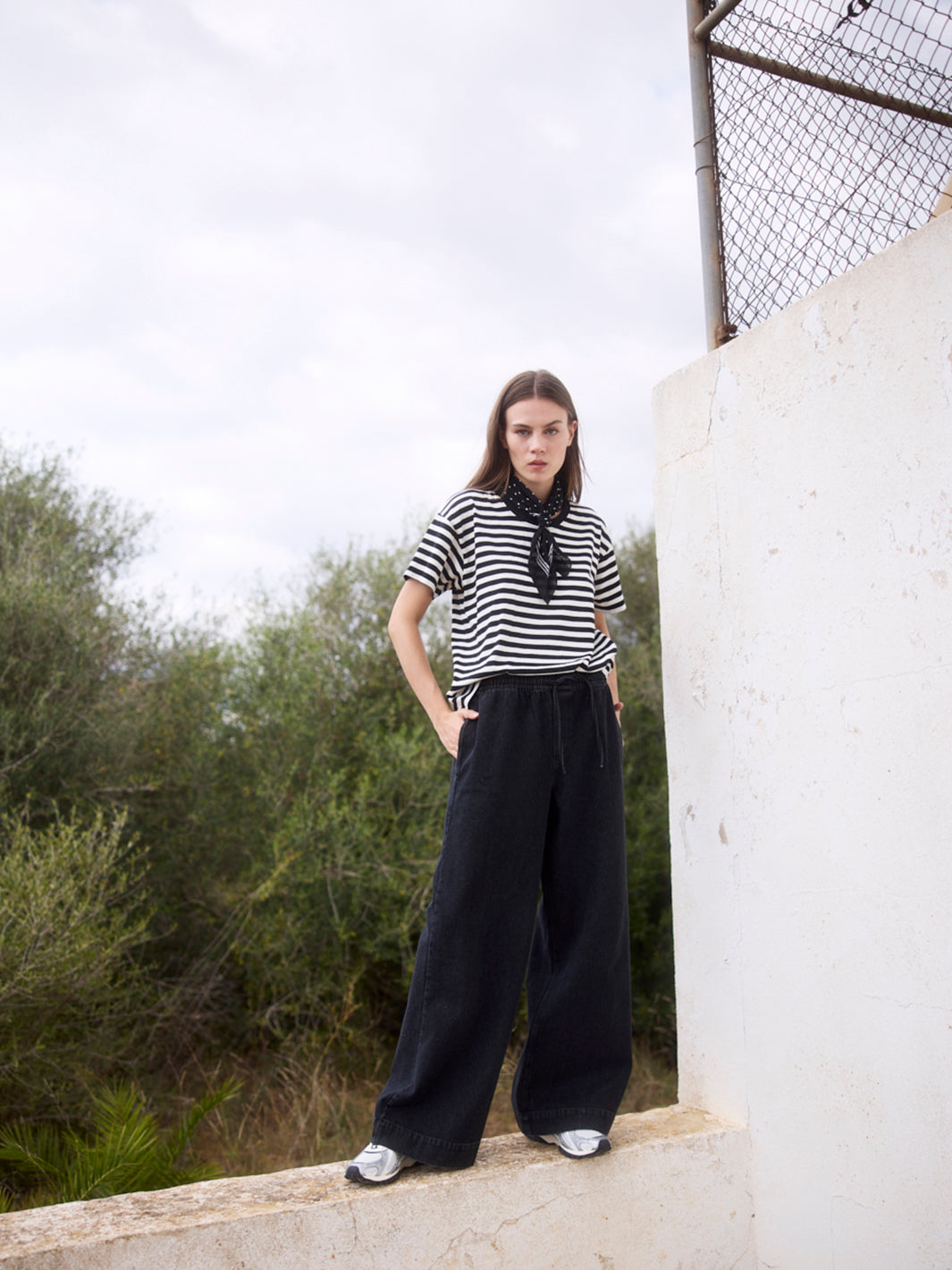 Modell trägt ein schwarz-weiß gestreiftes Relaxed-Fit T-Shirt aus Bio-Baumwolle, stehend auf einer Mauer in weit herausgezoomter Ansicht.