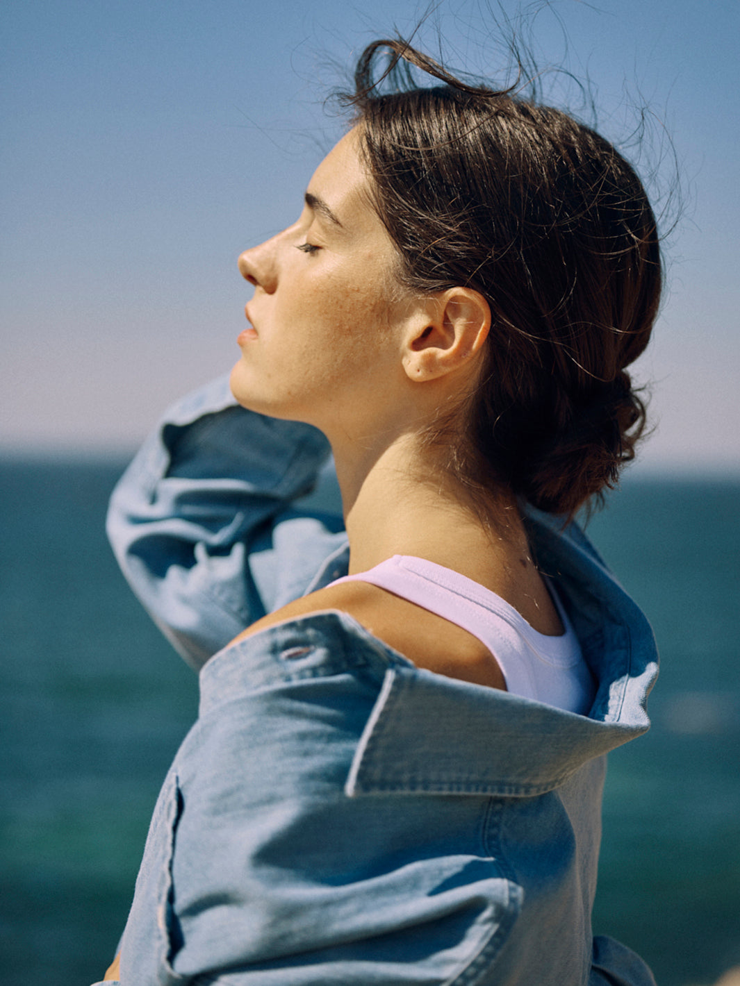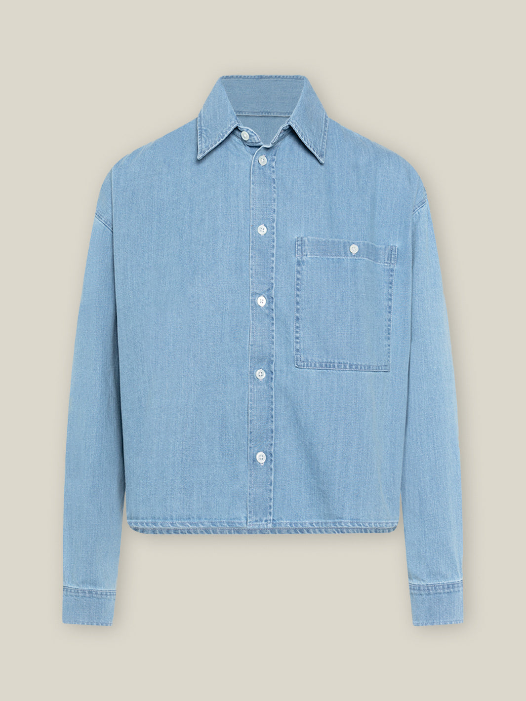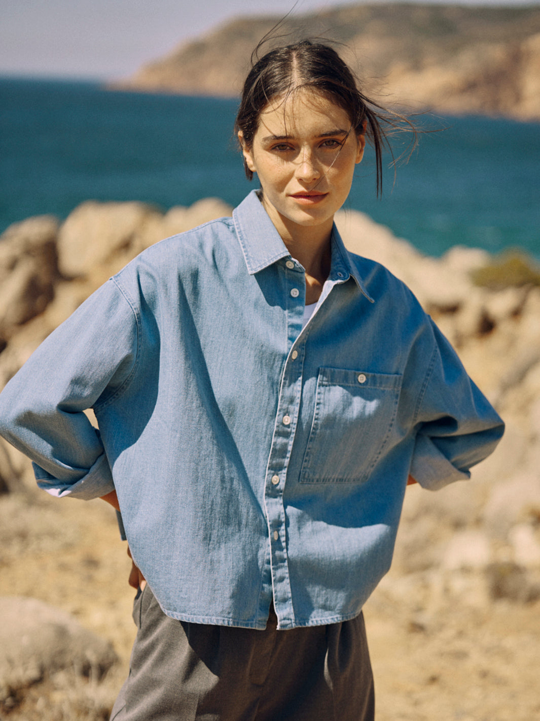 Unsere kurze Denimbluse aus reiner Bio-Baumwolle ist ein moderner Klassiker mit Overshirt-Charakter – soft im Griff, klar im Design und mühelos kombinierbar. Der kastige, leicht verkürzte Fit bringt entspannte Lässigkeit in jeden Look. Feminine Perlmuttknöpfe verleihen subtile Wertigkeit und machen die Bluse zu einem täglichen Essential.