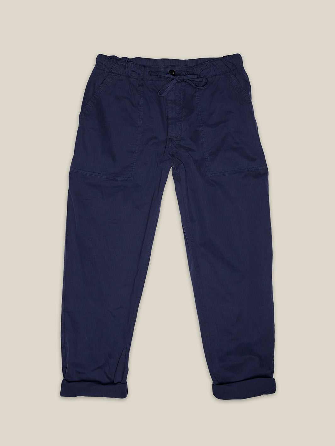 Zwei aufgesetzte Gesässtaschen komplettieren den entspannten Look. Die rechte Tasche ist mit einem Steinnussknopf zu verschließen.