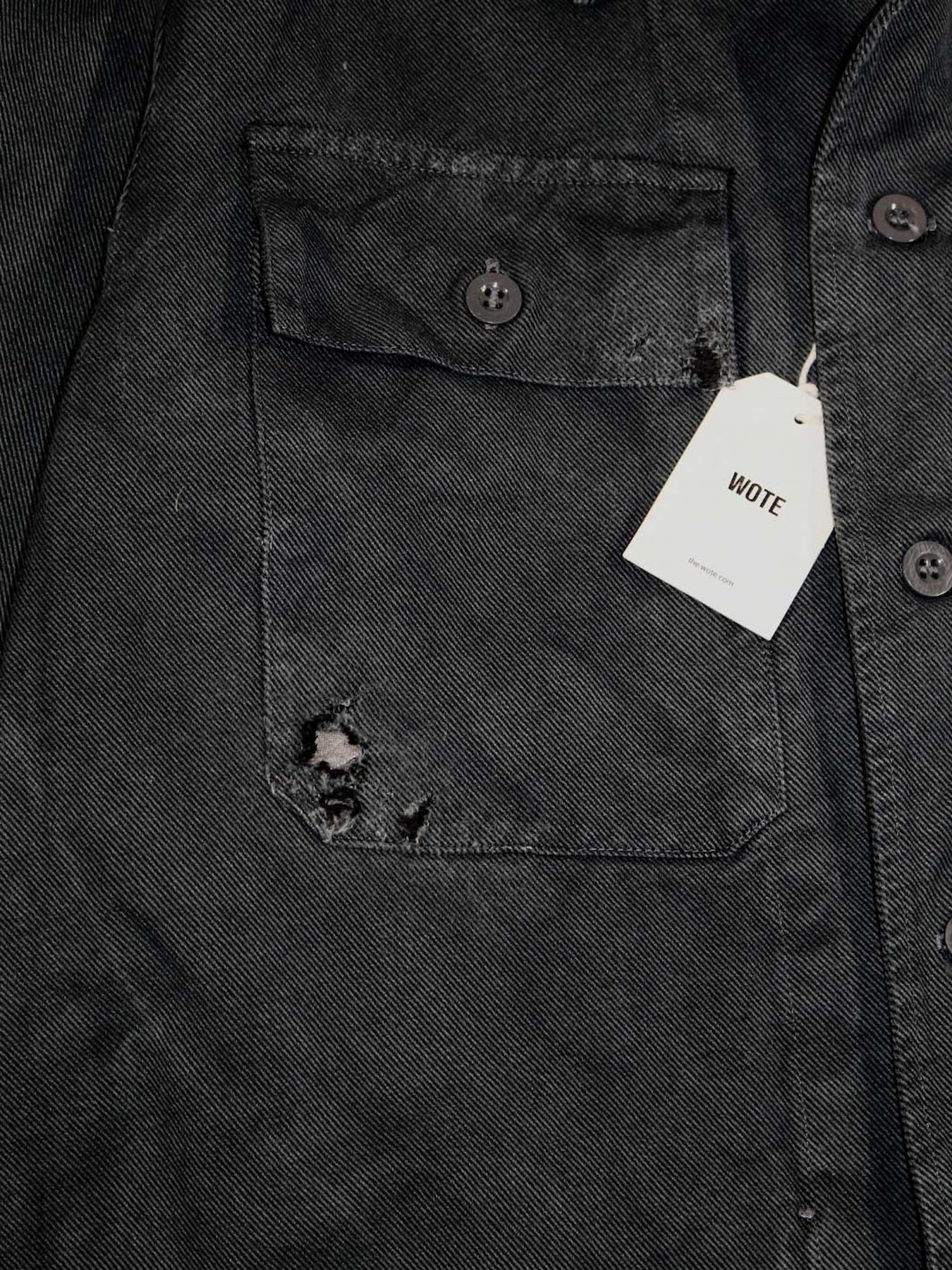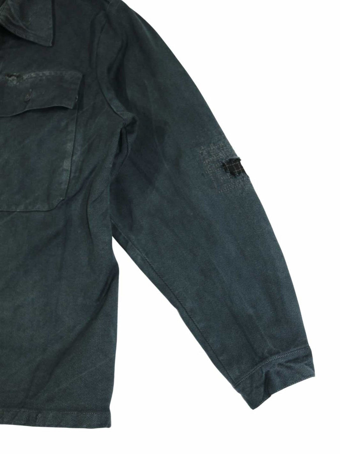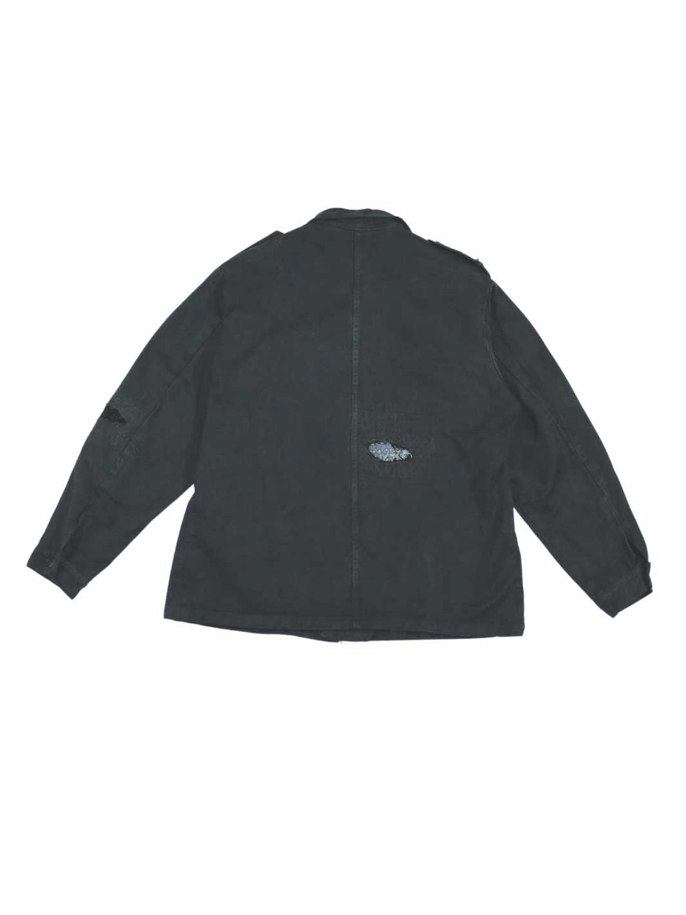 Das robuste Baumwollmaterial wurde grau überfärbt und mehrfach repariert. Die beschädigten Stellen sind größtenteils mit Fabric unterlegt und mit Repairstitchings stabilisiert worden. Die Reparaturen sind bewusst tonal gehalten und fügen sich ruhig in das Gesamtbild ein.