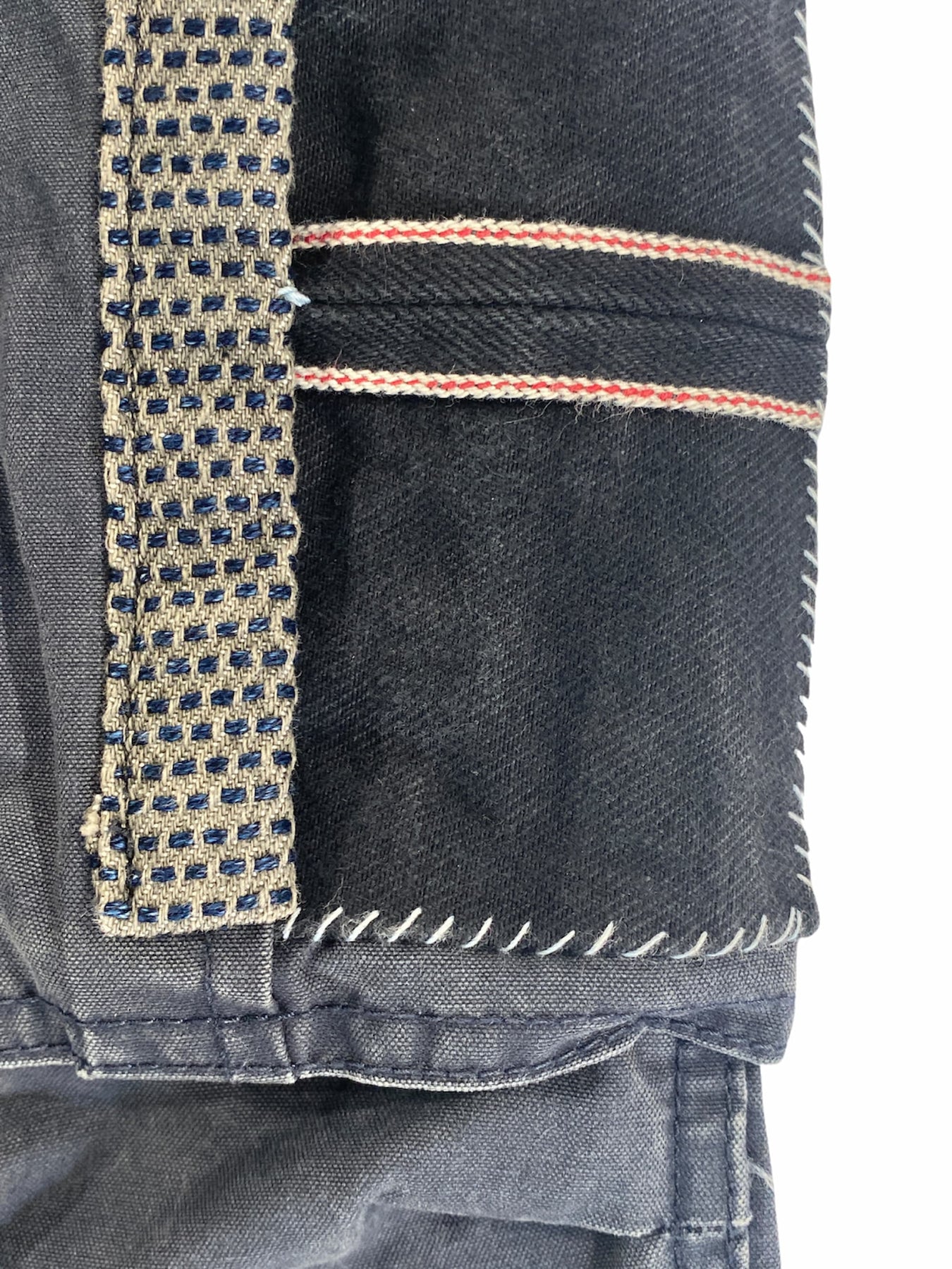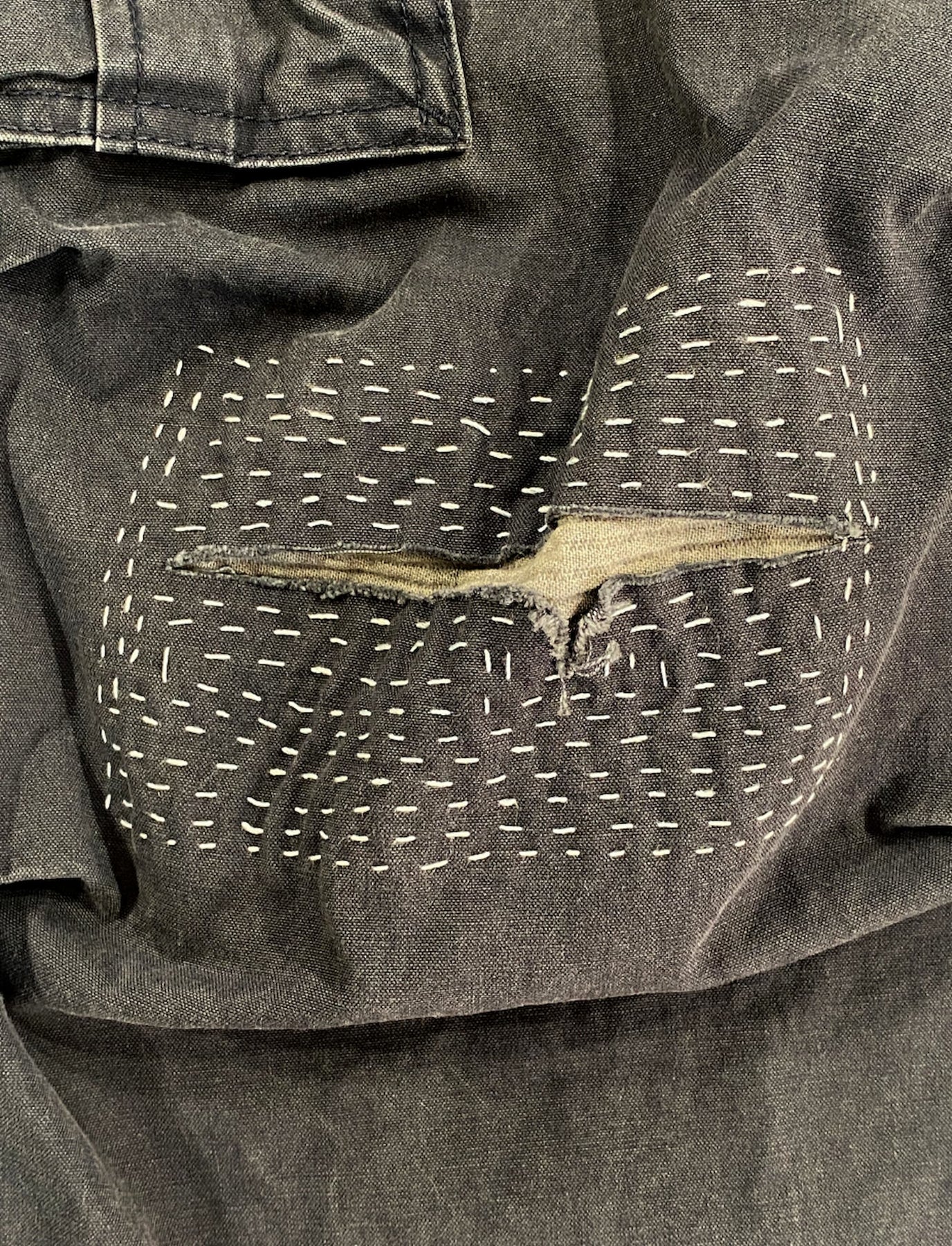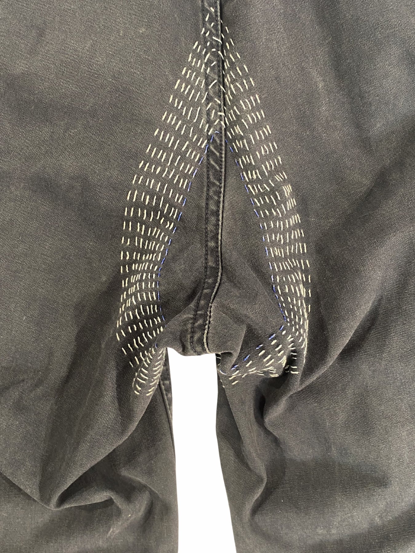 Das Besondere liegt im Detail: Aufwendige Reparaturen, Stitchings und Ziernähte wurden in sorgfältiger Handarbeit von Andi Kraus (AKS, Würzburg) umgesetzt. Jede Naht bleibt bewusst sichtbar und macht diese Hose zu einem tragbaren Sammlerstück.
