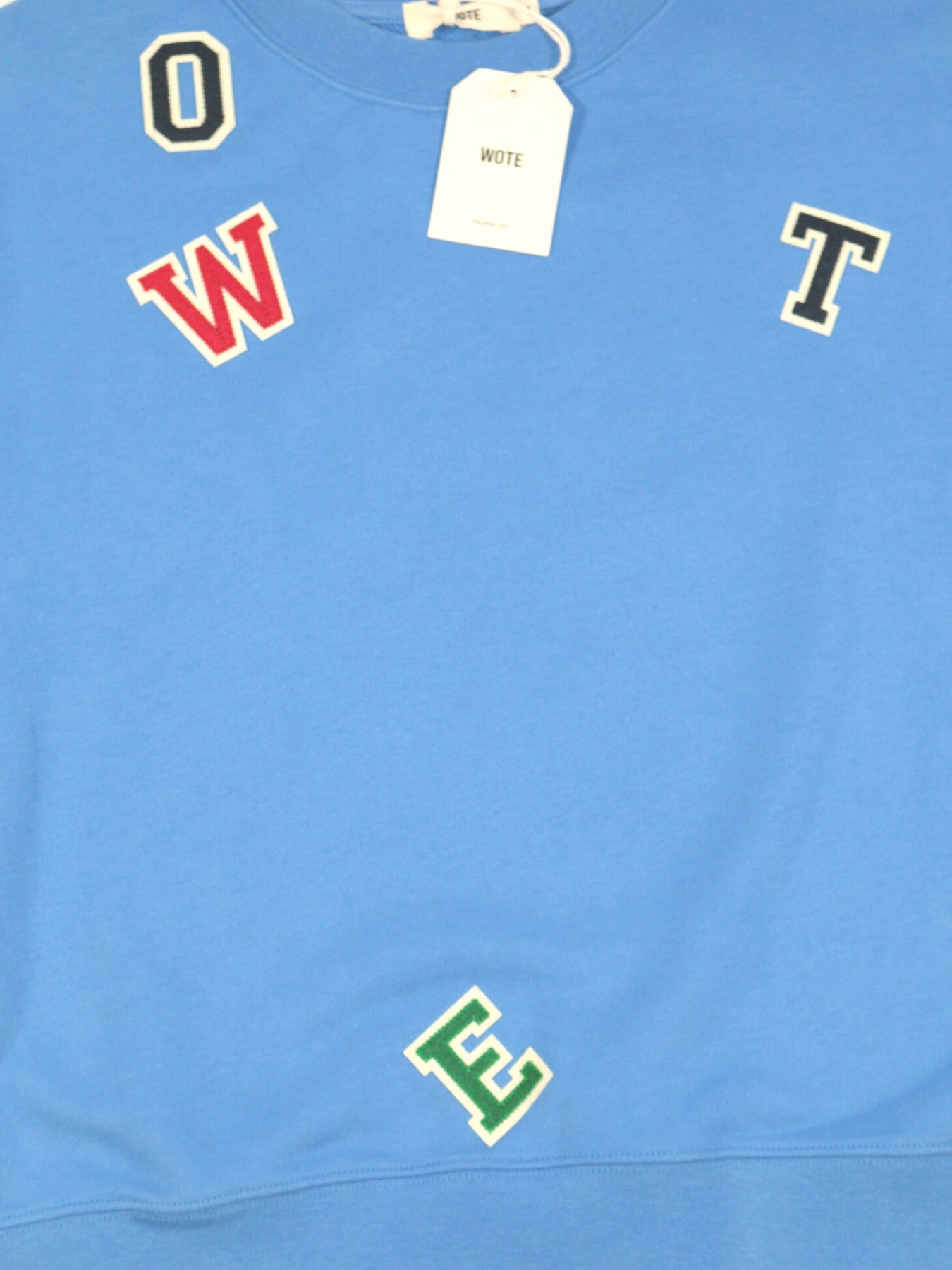 Gesamtansicht der handgesetzten Buchstaben-Patches auf dem Second Life Damen Sweatshirt in Blau